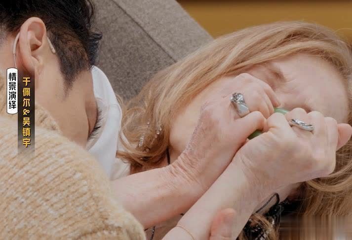 说完这句话之后,于佩尔老师直接坐了起来,而后俩人哼哼唧唧的就抱在了一起,吴镇宇的头在下面,于佩尔老师在上面,看到这里,我还是没有一点入戏的感觉,在这种综艺节目上临时表演,真的太尬了,老戏骨也不行。
